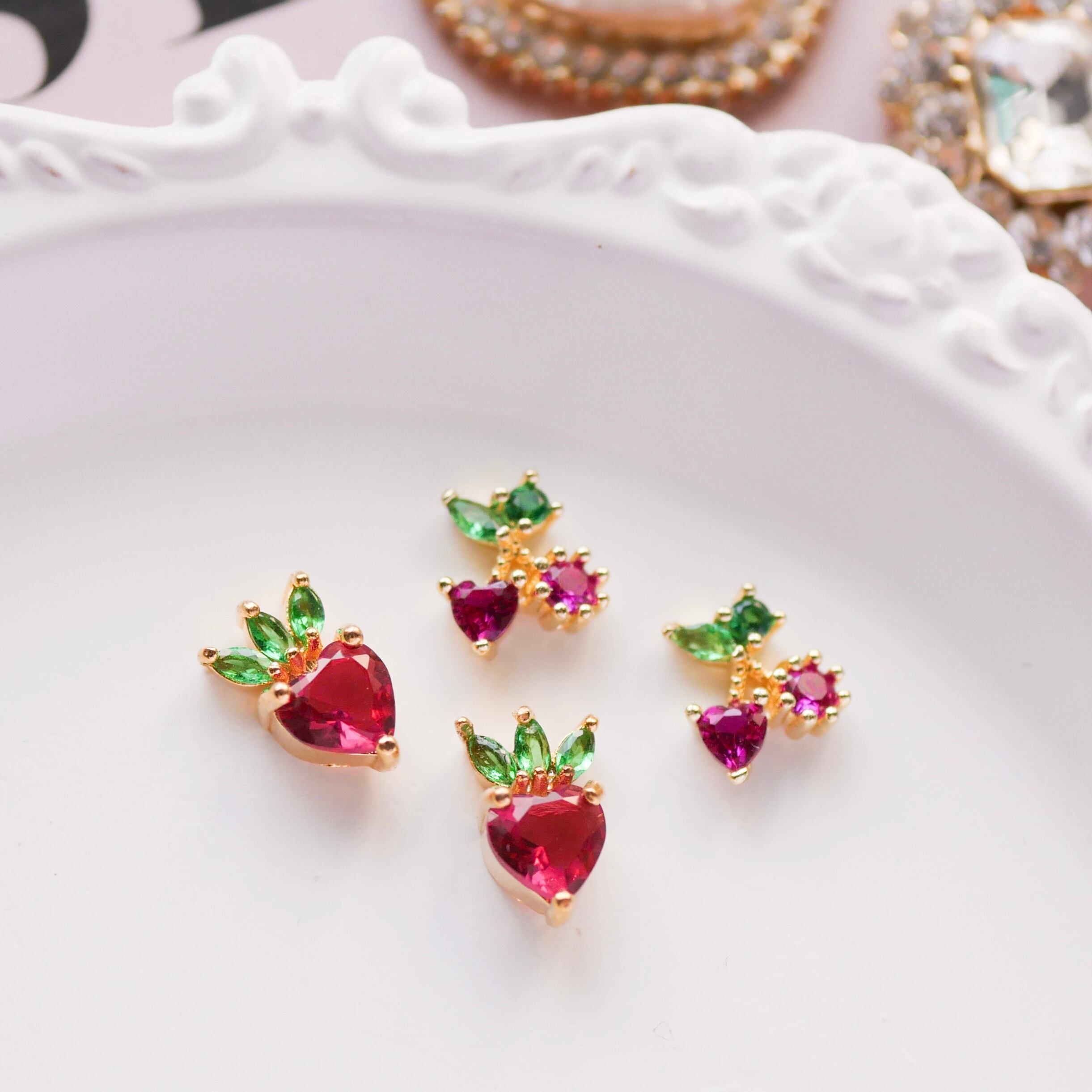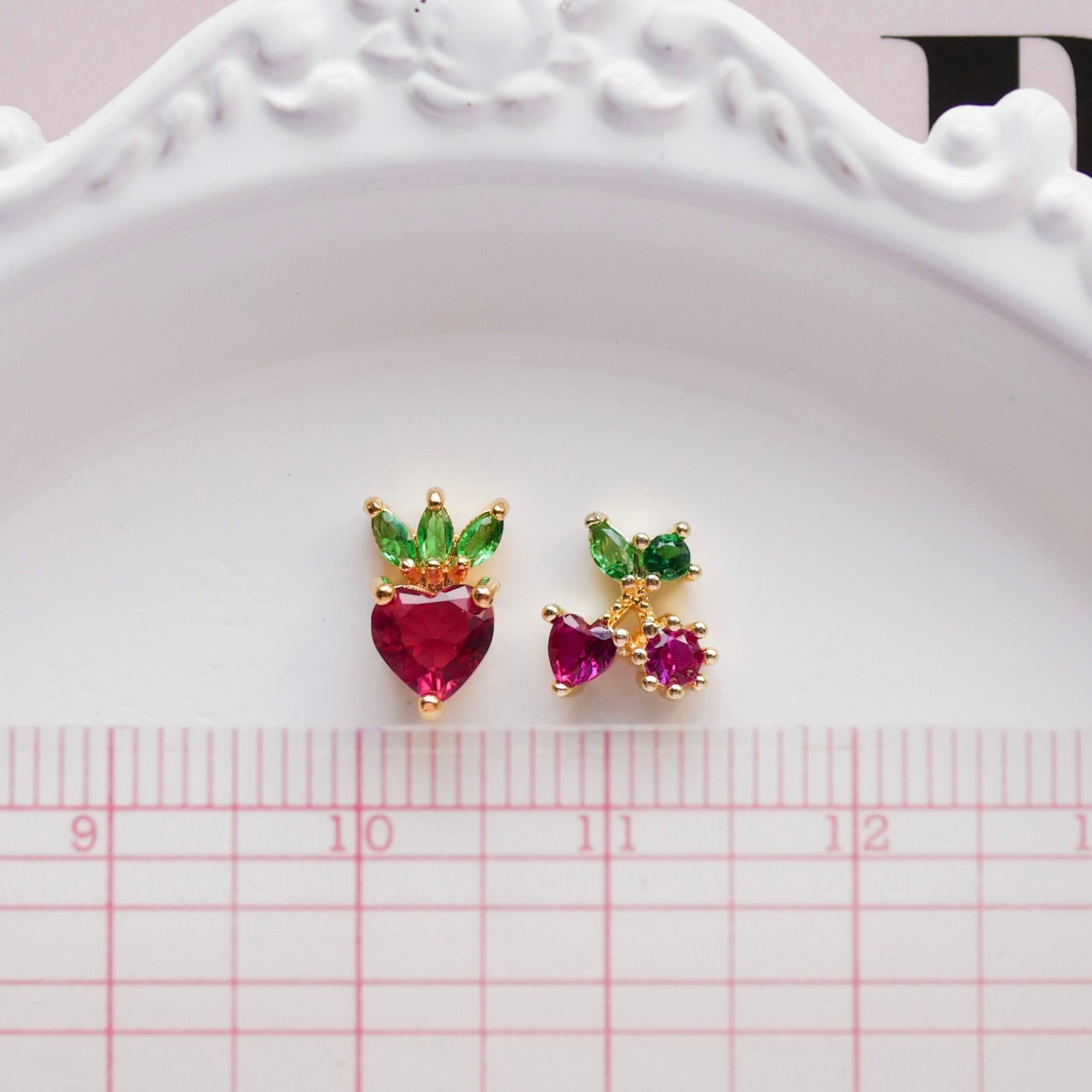 ハートのジルコニアストーンがいちごとチェリーになったキュートなモチーフパーツ
