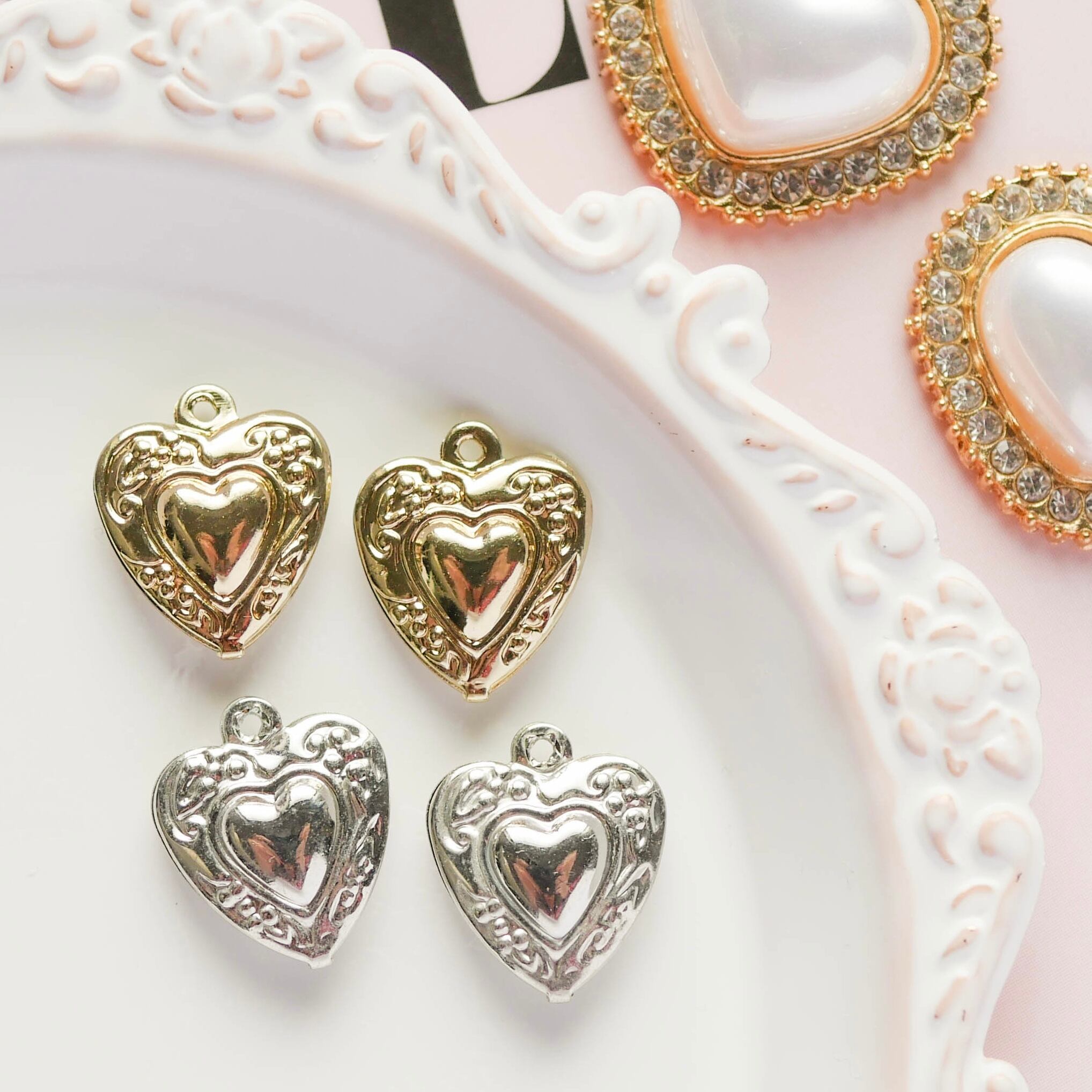メタルチャームにアンティーク風のデザインが施されたハート型のチャーム